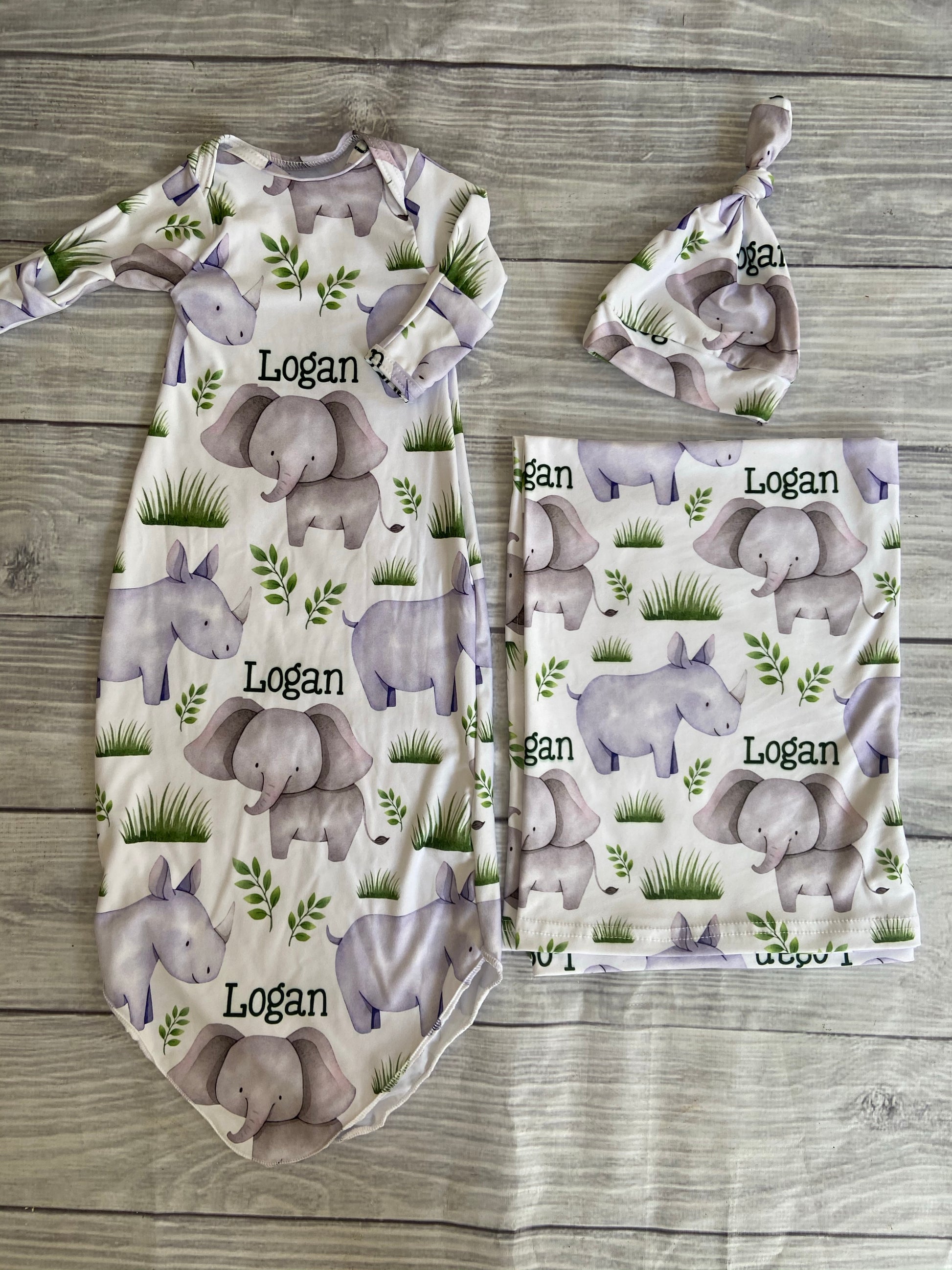 It's the perfect swaddle to wrap them in at the hospital for their first picture, has the ideal amount of stretch to wrap baby, and makes the perfect baby shower gift! Set includes a Gown, little hat, Swaddle Blanket and for girls a headband, made from 95% Poly; 5% Spandex Care Instructions: Machine Wash Cold - Gentle Cycle Phosphate Free Detergent Recommended for Color Care Line Dry / Air Fluff Do NOT use Fabric Softener